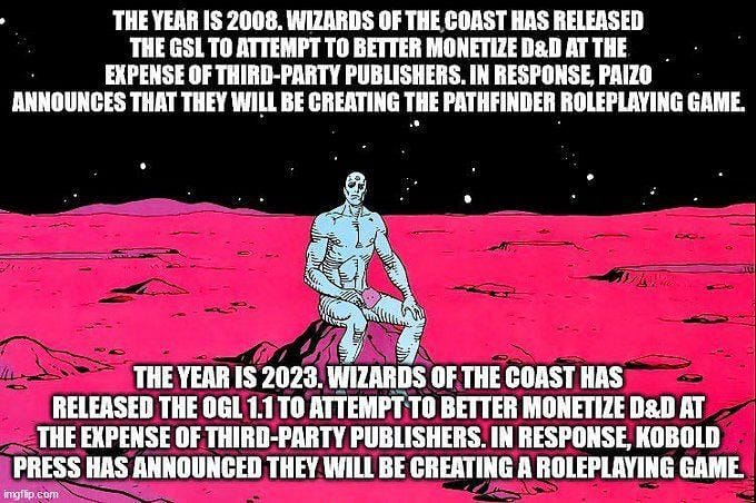 Campañas de desuscripción de D&D Beyond, live streams con abogados con miles de espectadores, memes y más memes. Y salieron después los pesos pesados de la industria a decir: no es por acá. MCDM y Kobold Press (proyecto Black Flag) anunciaron que iban a crear sistemas de juego propios e independientes de la OGL y el SRD de WotC. Privateer Press (editores del exitoso Iron Kingdoms, que hace poco volvió al sistema d20 compatible con D&D 5ta) tambien dijeron que estaban expectantes de ver que sucedia en la industria pero que no dudarian en tomar el camino que sea necesario para estar cerca de los fans. Pero la declaración final fue de Paizo, que con un contundente comunicado revisó la historia de la OGL original, y anunció que iban a apadrinar una nueva licencia que mantuviera el espíritu de la OGL 1.0 y subsanara los errores del pasado (como no tener la palabra "irrevocable", o dejarla en manos de WotC), mientras invitaban a participar a todos los publishers en la confección de la misma.