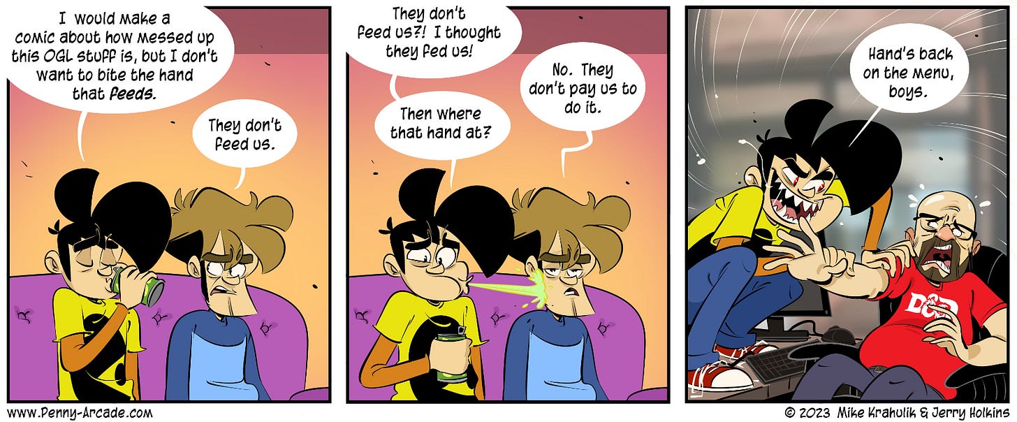 Ahora sí, la novedad es que hace un par de semanas WotC (Hasbro de fondo) hizo circular una nueva versión de la OGL (versión 1.1) entre varios publishers bajo un NDA. El contenido de la OGL 1.1 se filtró y el gran artículo de io9/gizmodo escrito por Linda Codega (que está en el título de esta nota) la diseccionó por completo, haciendo foco en algunos cambios que parecían una bofetada en la cara para toda la industria.
