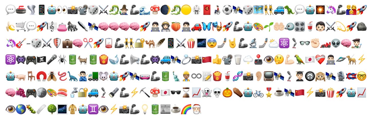 Esos son todos los emojis que usamos en relevante, desde el episodio 96, hasta el episodio 146. Con los episodios especiales totalizan unos 56. Siendo el Pareto de emojis: 🦾(12), 🚀(11), 📱(6), 🤖(6), 📸(6), 🧠(6), 💬(4), ⚔️(4), 🎲(4), 🦄(3), 👩🏻🚀(3), 🛰️(3), 👁️(3).