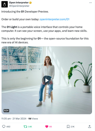 Finalmente estamos ante la puerta del automatismo absoluto (X, aporte involuntario del famoso Seba Bauer): Resulta que se pusieron la 10 y se la jugaron por un device (si, lo leíste bien, un device) que te permite hablarle y hacer que éste ejecute tareas en tu computadora. Es como una especie de Selenium en esteroides que mueve el mouse, como el cuadripléjico de arriba, pero en este caso es un AI que puede interpretar toda la interfaz de tu compu, entiende tu lenguaje coloquial y encima le podes enseñar nuevas tareas. Es como contratar un minion o un Mechanical Turk pero con más huella de carbono. ¿Y lo revolucionario dónde está? En el video que presentan a este device llamado O1, de The Interpreter, y al sistema operativo open source que quieren que sea el que reine de todo automatismo. Lo sorprendente es lo disonante del video, muestra una mujer con una voz -además de masculinísima- parecida a la Sam Altman. Fuera de broma, lo revolucionario es que este aparatito sencillo se monta arriba al Pin de Humane, y a la pokedex de Rabbit Inc, la R1 (que ni siquiera la mencioné en Relevante por lo estúpida que la idea final termina siendo). Lo que realmente vale acá valen son “los rabbits”… o esos minions que hacen la tarea por vos. Ese es el verdadero futuro.