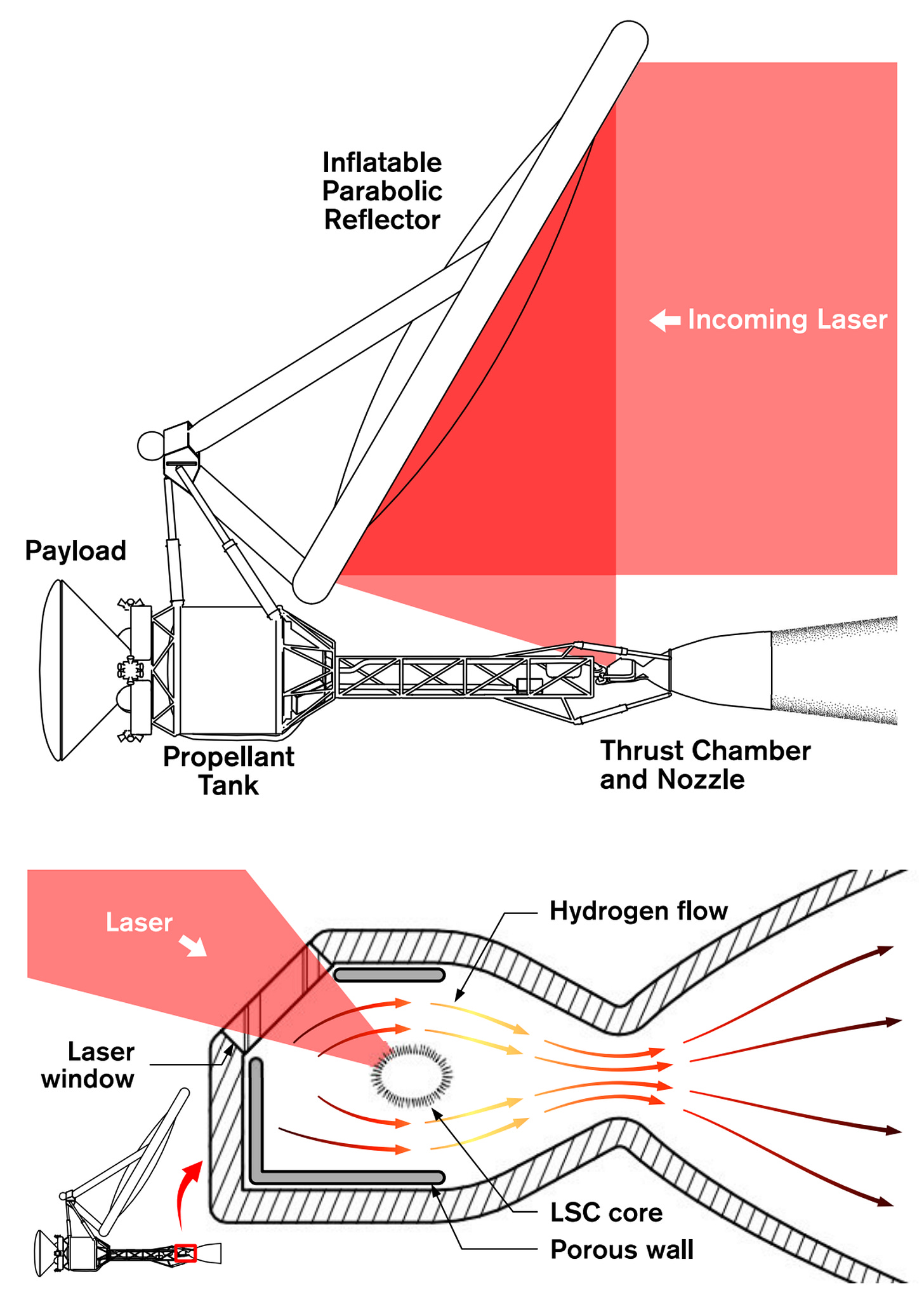 Mandar una encomienda a Marte en 45 días (Gizmodo): Ahora mismo viajar a Marte con uno de nuestros mejores propulsores lleva seis meses, siempre y cuando despeguemos cada 26 meses, que es el momento optimo de cercanía (momento denominado Oposición). ¿Cómo mejoramos eso? Visitando un concepto de propulsión ya conocido: apuntar desde la tierra un super láser a una cámara con hidrógeno o deuterio, que genera plasma para la propulsión del cohete de un “trasbordador” (ver gráfico). De esta manera podemos acelerar de manera continua llegando a velocidades impensables. Entraría a la orbita de Marte para hacer “delivery” del payload en solo 45 días. (pego 2 gráficos porque son realmente hermosos y esclarecedores). Todo este modelo es teórico todavía.